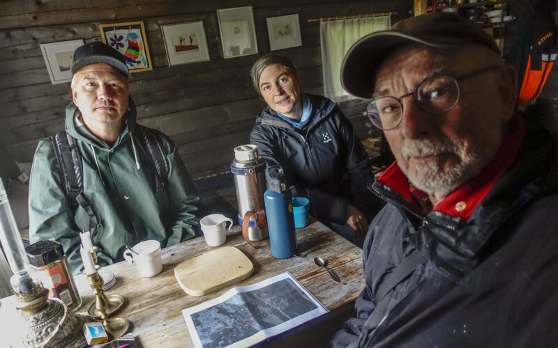 Vi hade lite otur med vädret. Nära noll och snöfall när vi kom upp på torsdag, sen eftermiddag. Men humöret var gott och vi tog oss ut i skogen både på fredagen och lördagen. I hällande regn vandrade vi runt, dels på västsidan nedanför Björntjärnsvägen, genom de bestånd som gallrats. Sedan österut, uppför Kolberget. Uppe vid Arken pausade vi i stugan, fikade och hämtade nya krafter. Gick sedan först bort till stora tallågan och sen nerför branten ner till lärkplanteringen. Vi konstaterade att den 19 år gamla planteringen nu vuxit till imponerande träd. Mycket glädjande. När vi konstaterat detta vandrade vi neråt och åkte tillbaks till Fryksås. Tände brasa och torkade oss och kläderna. Nöjda.